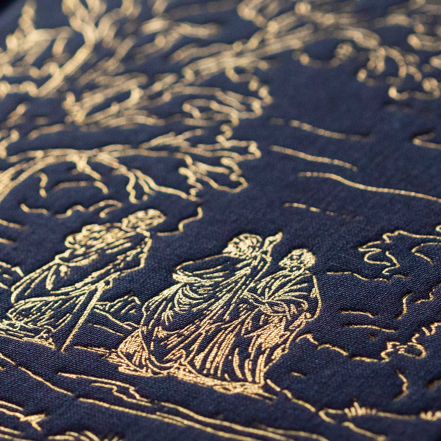 The illustration is printed lightly in the background on the dust jacket with the title of the book presented in bronze foil. The illustration is repeated under the dust jacket with foil blocking into the cloth hardcover.